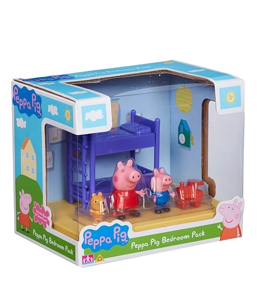 Contains peppa pig figure, george pig figure and bunk bed Comes with a bright backdrop...