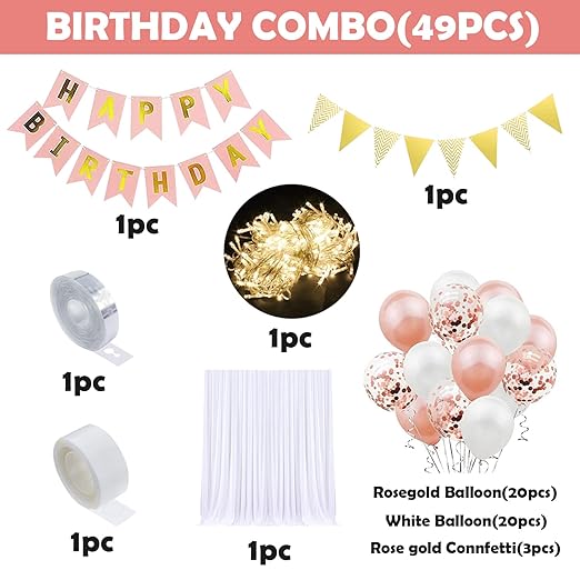 ALL IN ONE BOX DECORATION ITEMS FOR BIRTHDAY PARTY: The pack includes 1Pc rose gold...