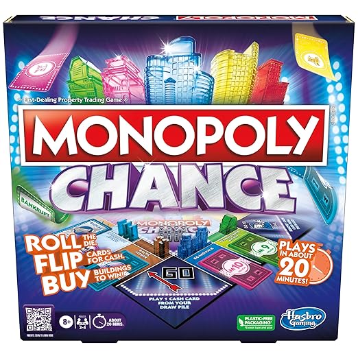 Monopoly Chance Board Game for Adults and Kids | Fast-Paced Family & Party Board Game | Ages 8+ | 2-4 Players | Birthday Gift for Kids & Families