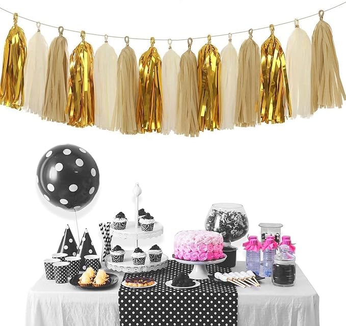 (15 Pieces, 1.5 Meter) Paper Tassels for Decoration, Paper Tassels Garland, Paper Tassel for Party, Paper Tassels, Birthday Decoration items - Beige, White & Golden