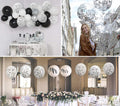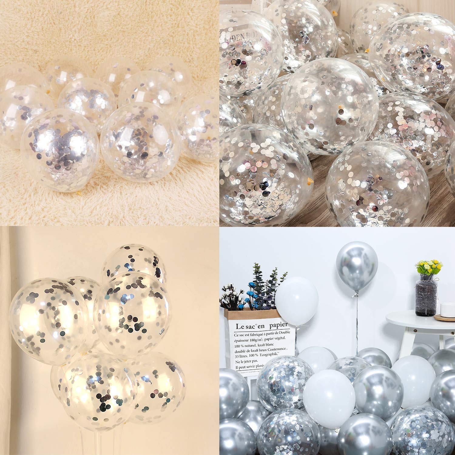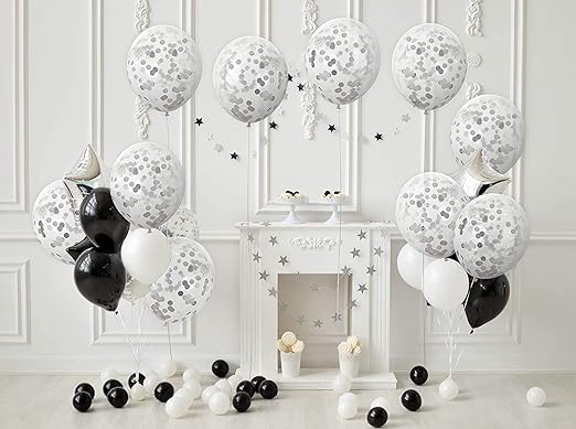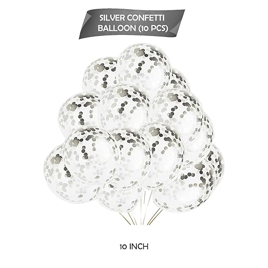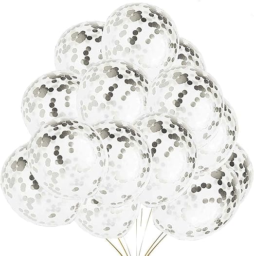 - Party Balloons Set Includes:10pcs pcs silver confetti balloons, all the balloons are 12 inch inflated.It can be filled with helium gas or hand or electric balloon pump. These silver confetti balloons looks really stylish in anyones birthday decoration like your kids, husband, friend, friend, women, wife etc, It can be use for any age like 1 year/1st/First, 2nd, 10th,25th,50th,60th,70th etc.