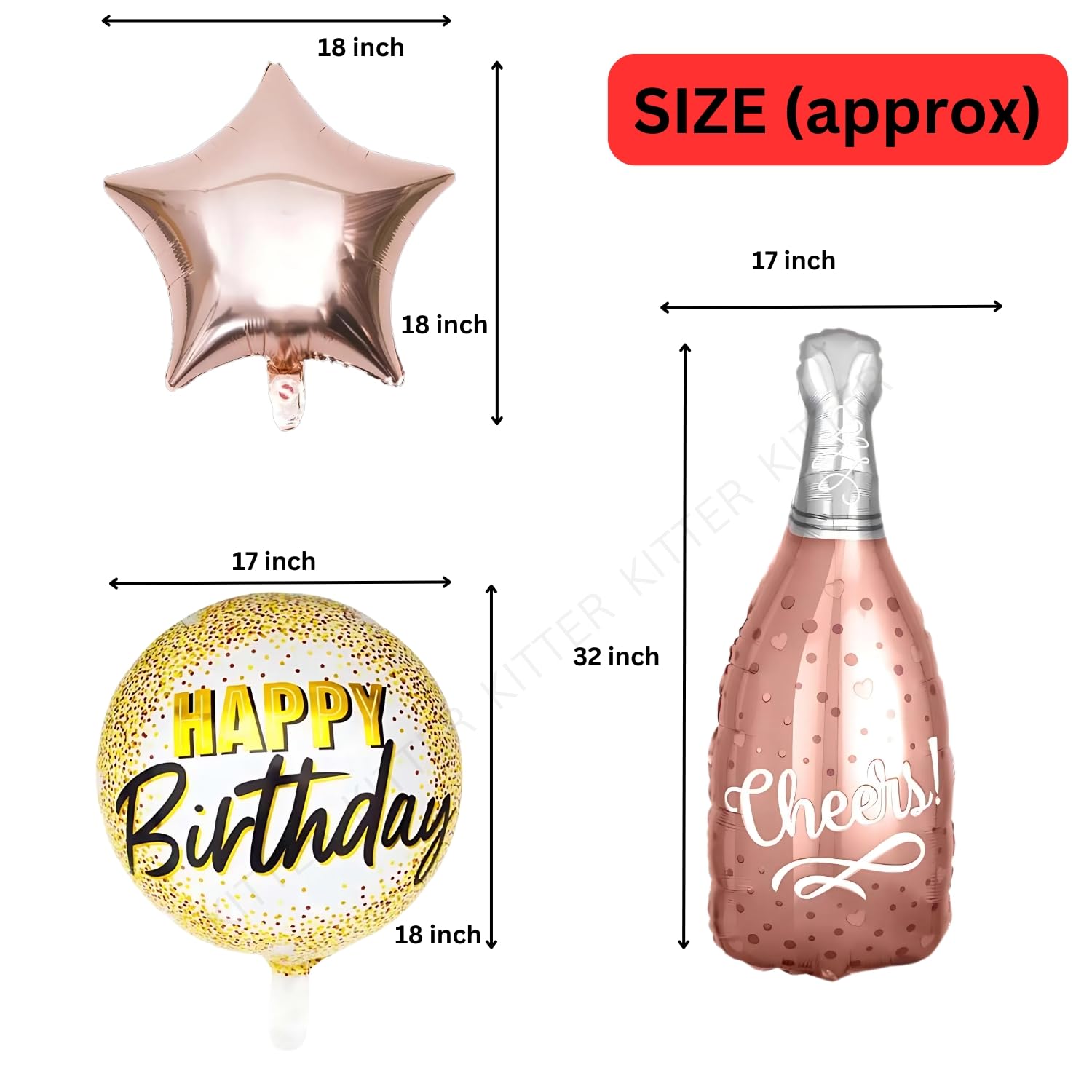 - This packet includes 5Pcs of very exclusive foil balloons for decorations like cheers, champagne, Wine bottle and star foil balloon. These party balloons for decoration looks very elegant when decorated on the walls or hung from ceilings. This can be used as 18th birthday decorations for kids, cheers party decoration.