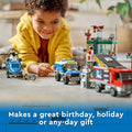 - Features a 2-floor multifunctional bank building, crooks’ heist truck toy, police helicopter and truck, plus a toy drone for lots of chase
