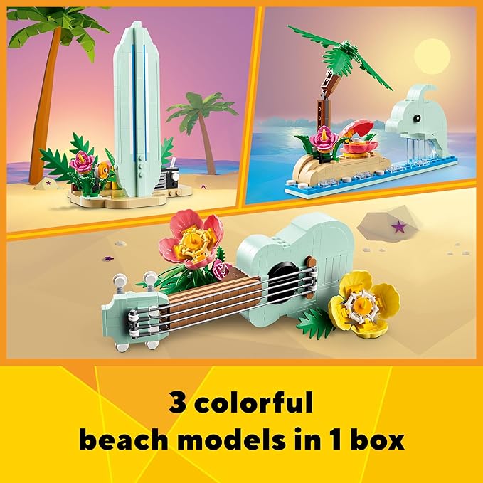 - 3 beach models including a surfboard toy in 1 set – Girls and boys aged 8+ build and rebuild 3 different beach models using the same bricks with the LEGO Creator Tropical Ukulele instrument toy