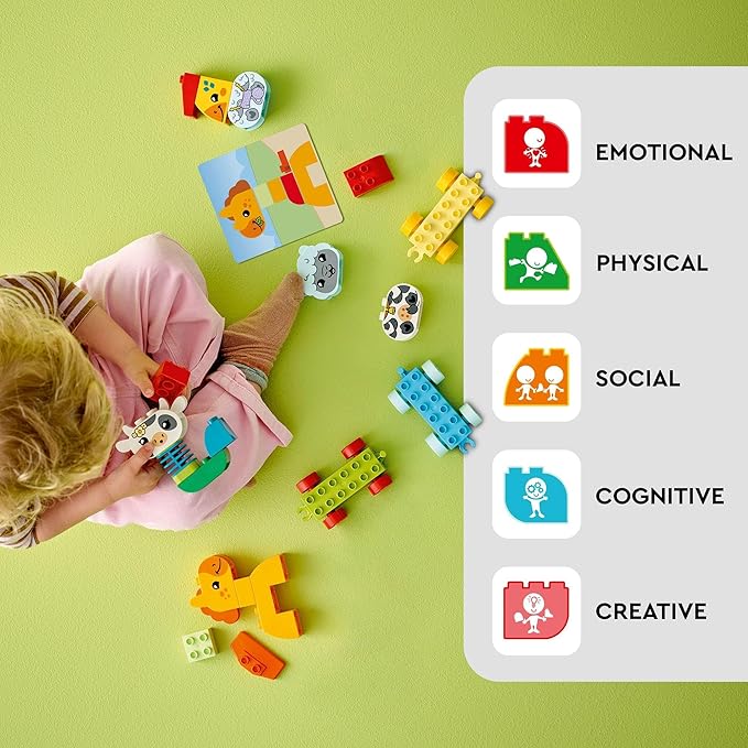 - Train toy for creative play – Toddlers follow instruction cards to build farm animals with this educational toy; they can use the extra DUPLO bricks provided to create their own animal toys