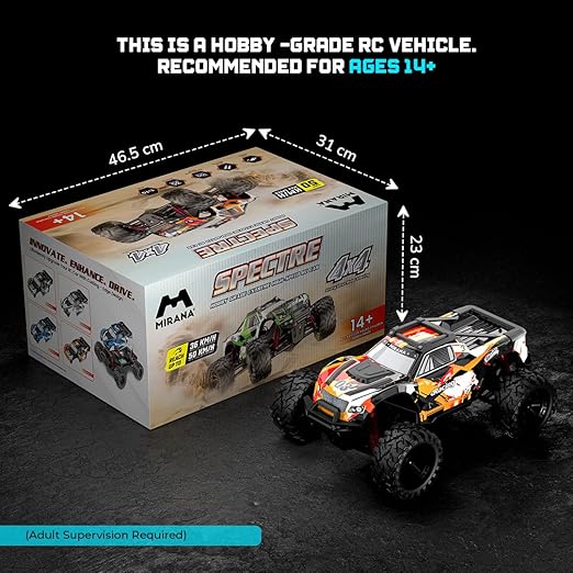 - ✅ 1:10 Scale High-Speed RC Car – Up to 50 kmph! The Mirana Spectre monster truck reaches speeds up to 36 kmph with a 2-pack battery and up to 50 kmph with a 3-pack. Upgrade to a brushless motor for a staggering 75 kmph experience.
