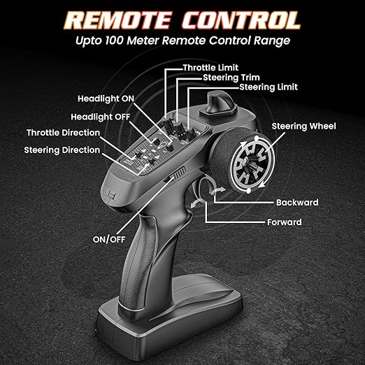 - ✅ 100-Meter Remote Control Range – Stable Connection The 2.4GHz remote ensures long-range control up to 100 meters with no signal drops—perfect for outdoor adventures and fast-action racing.