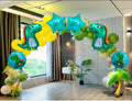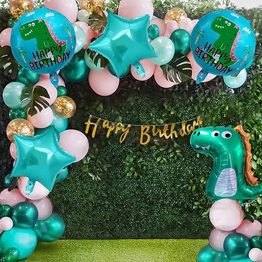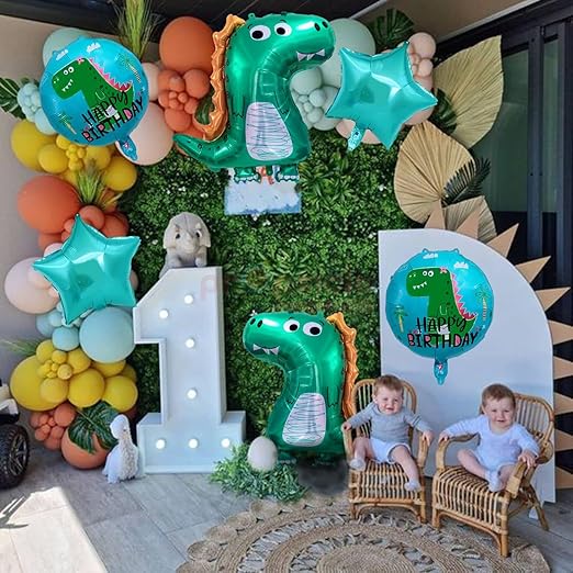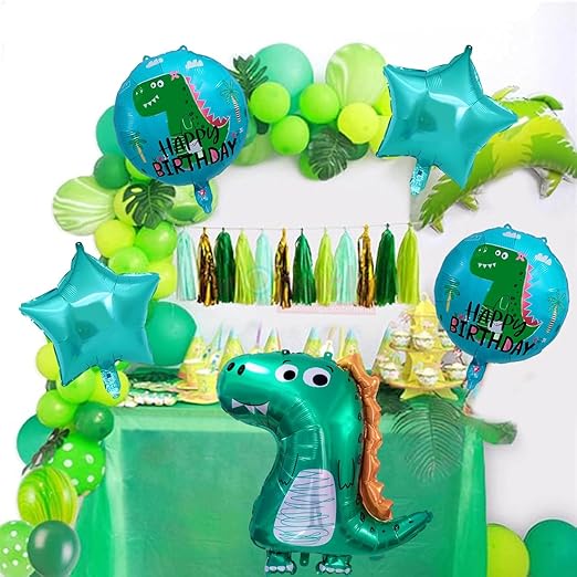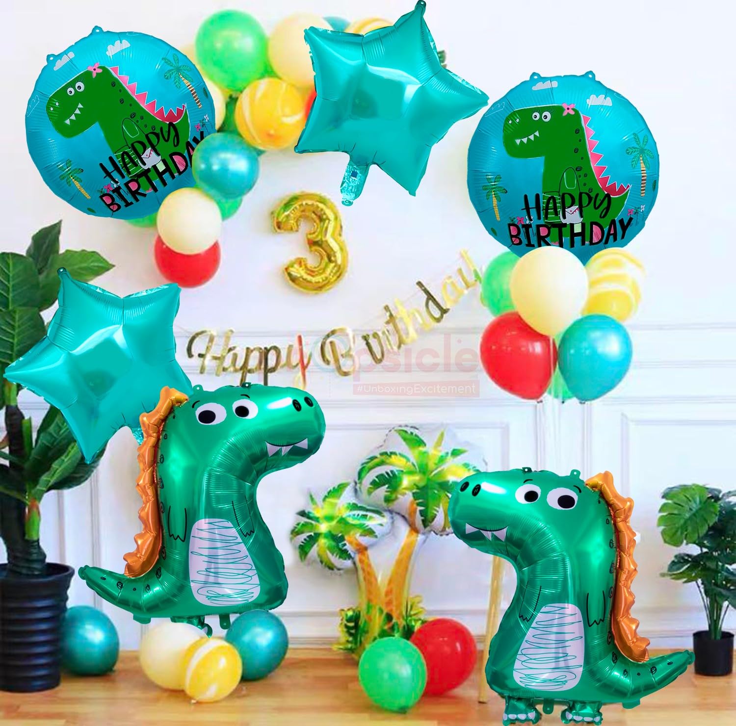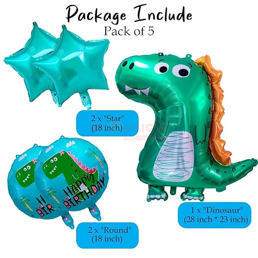 - Package Contents: The complete pack contains 5 balloons, 1 pc of 28 inch Dino Foil Balloon, 2 Pcs of Printed Round Foil Balloons, and 2 Star Foil Balloon.