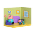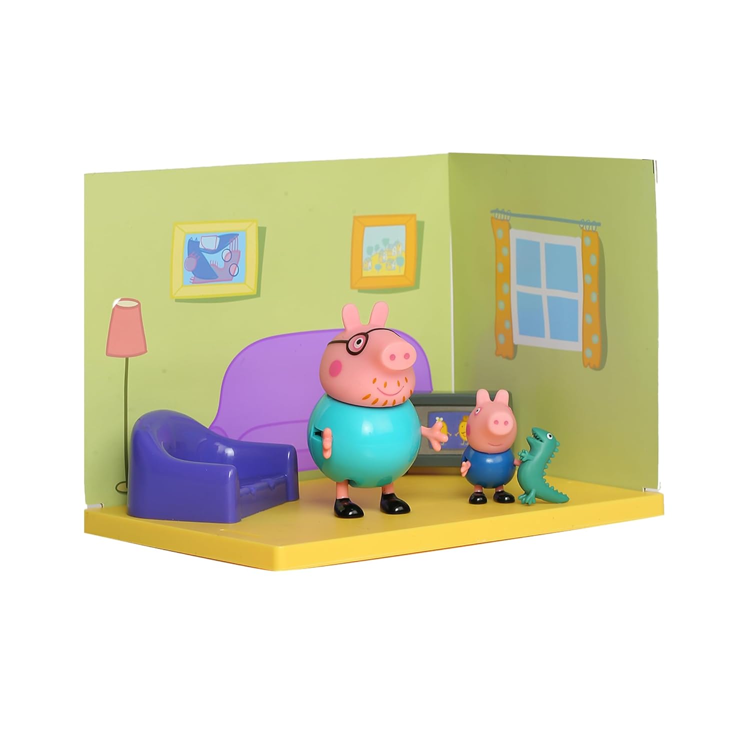 - INCLUDES POSEABLE FIGURES AND ACCESSORIES: Comes with poseable Daddy Pig and George figures, living room accessories and background scene card with holders.